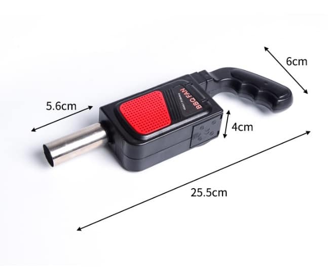 Comment utiliser : Installez quatre batteries no. 5, allumez l’interrupteur, vous pouvez souffler le vent et accélérer l’allumage du charbon de bois