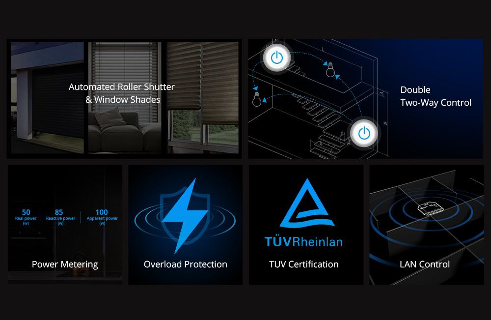 Working mode: DUALR3 is equipped with switch mode, motor mode and instrument mode. One of the typical features is the intelligent control motor mode of roller shutter and curtain. The switch module provides maximum flexibility for your roller blinds and curtains, and can remotely control and schedule scheduled events through applications, whether you are at home or outside. Two way control. In contrast to simple relays, the dual relay switch module distributes the load to two inputs, which allows you to independently control both devices in both directions.